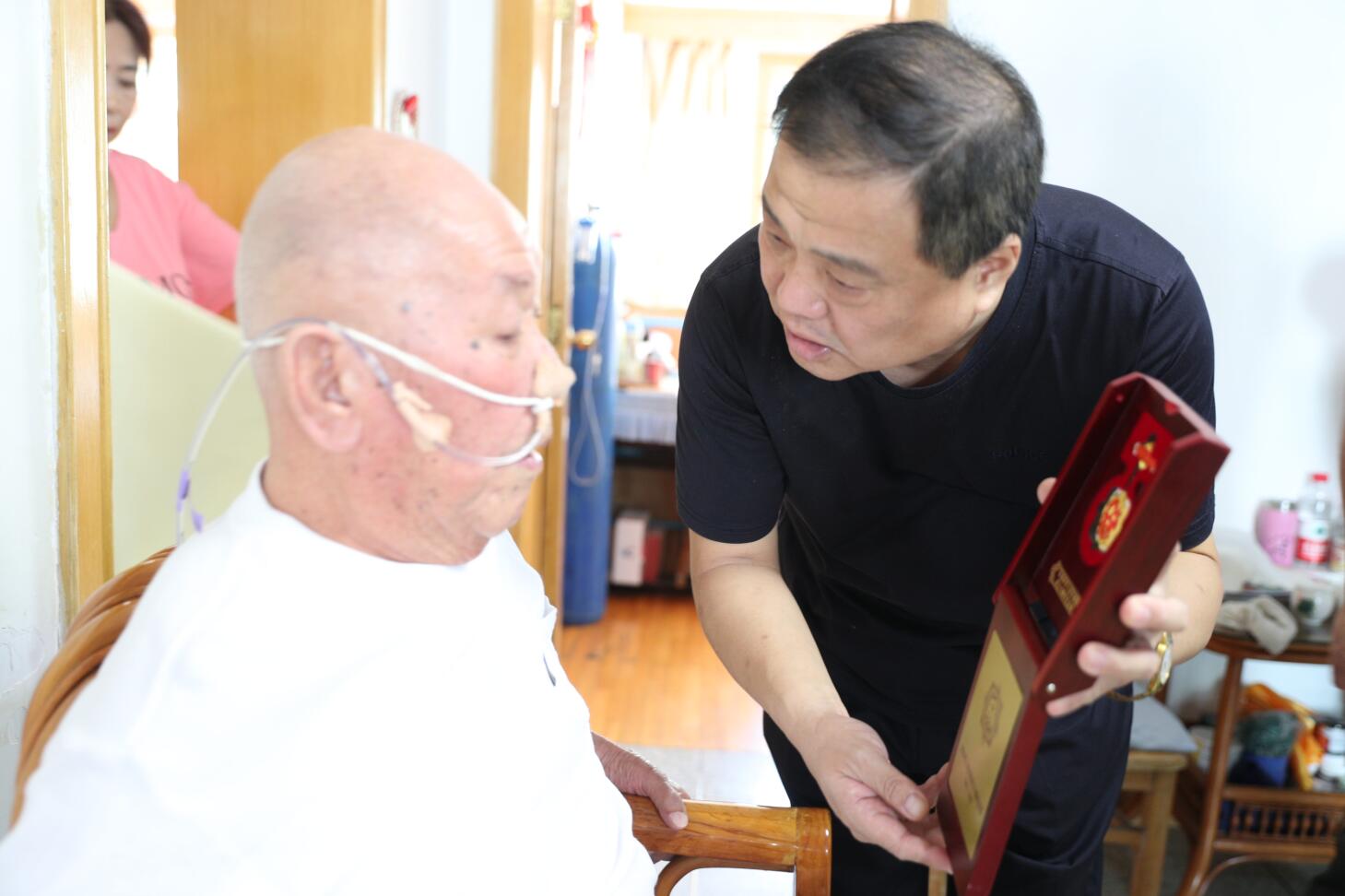 9月23日上午,青島安裝建設(shè)股份有限公司紀(jì)委書記、工會(huì)主席李金通與相關(guān)同志帶著上級(jí)領(lǐng)導(dǎo)部門和公司領(lǐng)導(dǎo)的重托,將這枚閃耀著光輝象征與最高榮譽(yù)的獎(jiǎng)?wù)滤偷搅艘娮C共和國(guó)誕生和發(fā)展奇跡并為之做出突出貢獻(xiàn)的全國(guó)勞模賀再奎及家人手中。感謝他為祖國(guó)和人民的無(wú)私奉獻(xiàn),更感謝他為青島安裝公司帶來(lái)的無(wú)尚榮耀。